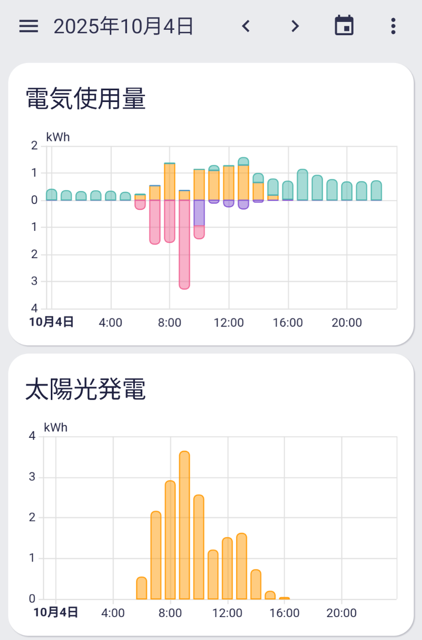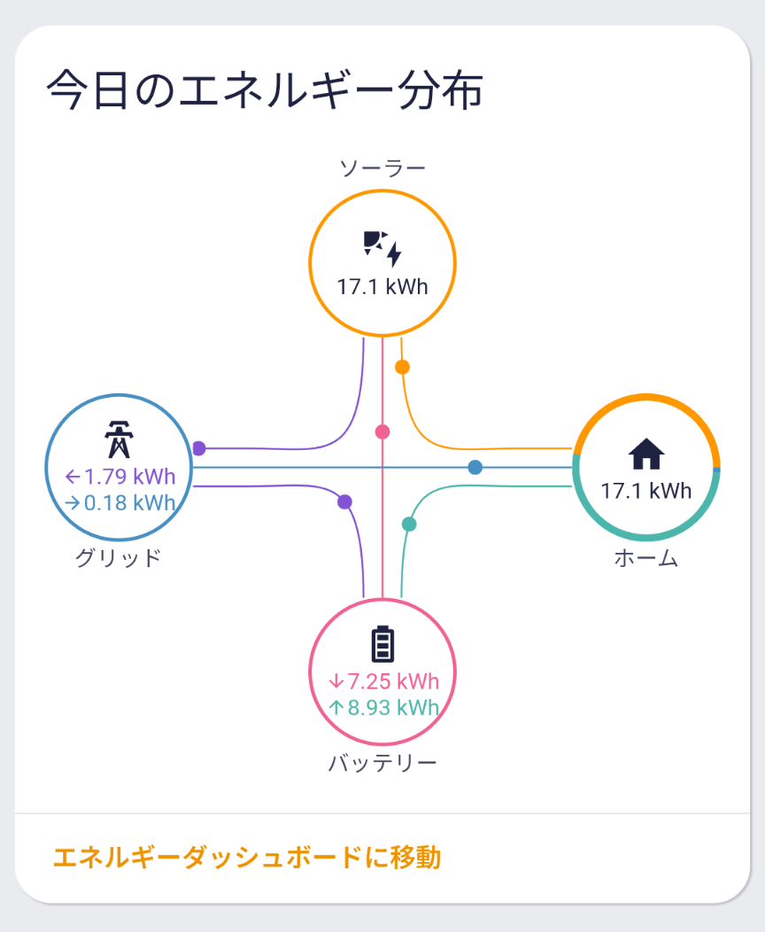 HomeAssistantはまだ使い始めたばかりなので、わが家では太陽光パネルと蓄電池のモニタリングしかできていませんがこんな感じで表示することができます。