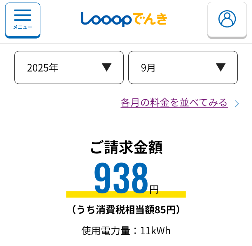 オール電化なのでガス代は無くて電気はLooopでんきと契約しています。