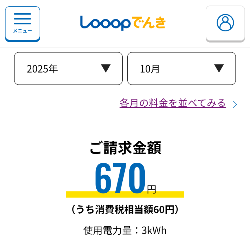 オール電化なのでガス代は無くて電気はLooopでんきと契約しています。