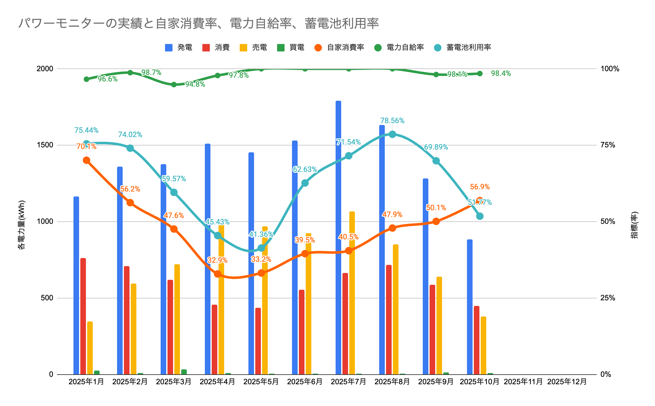 指標は昨年とほぼ変わらずですね。日が短くなっているので自家消費率が上がり、冷暖房が不要な中間期なので蓄電池利用率が下がっています。11月からは暖房の使用に伴ってどちらの指標も上昇する見込みです。