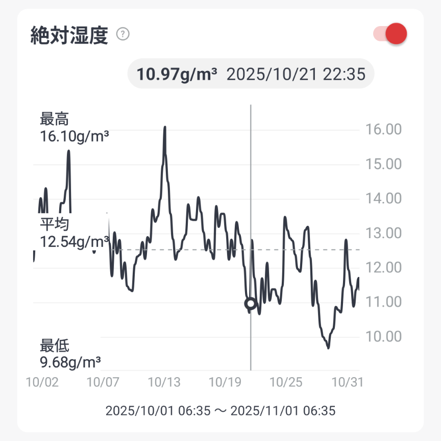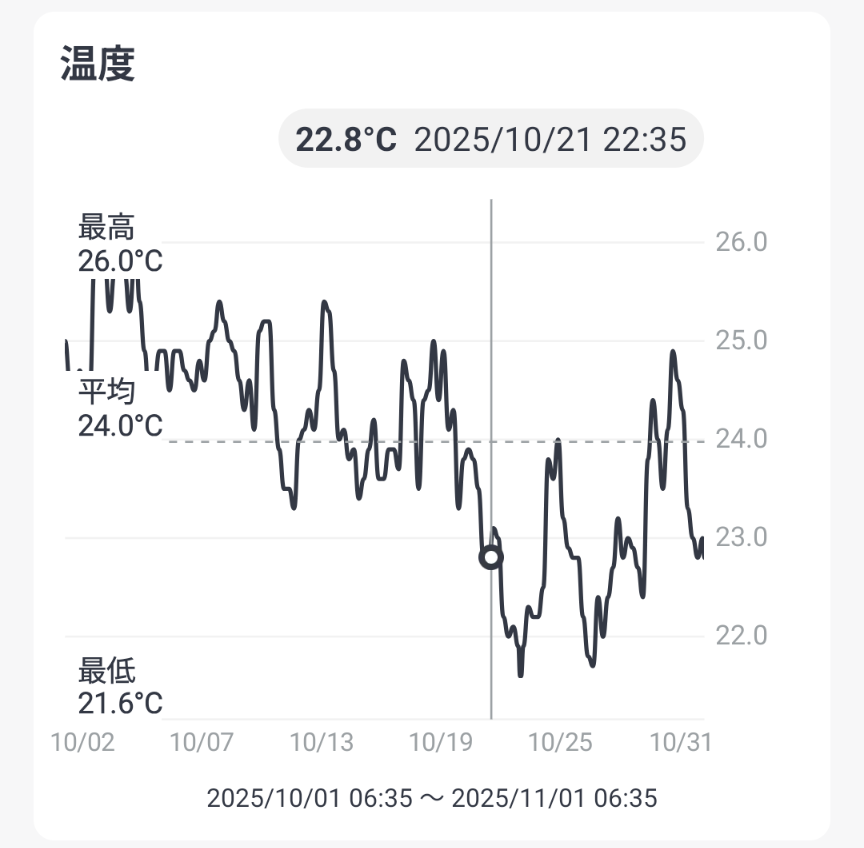 続いて同じ部屋で去年、2024年10月の温湿度はどうなっていたかというと…。