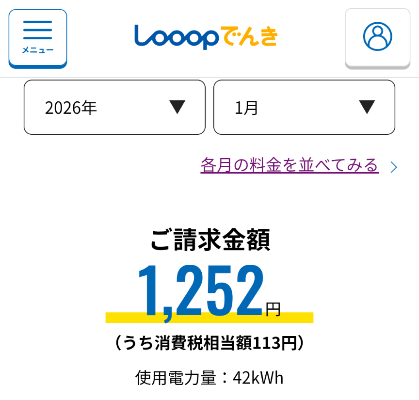 オール電化なのでガス代は無くて電気はLooopでんきと契約しています。