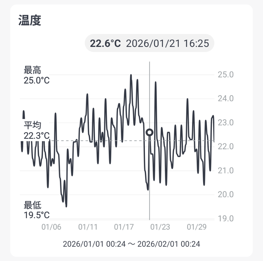 温湿度が比較的安定している1階寝室を定点観測しています。1か月の推移はこんな感じです。